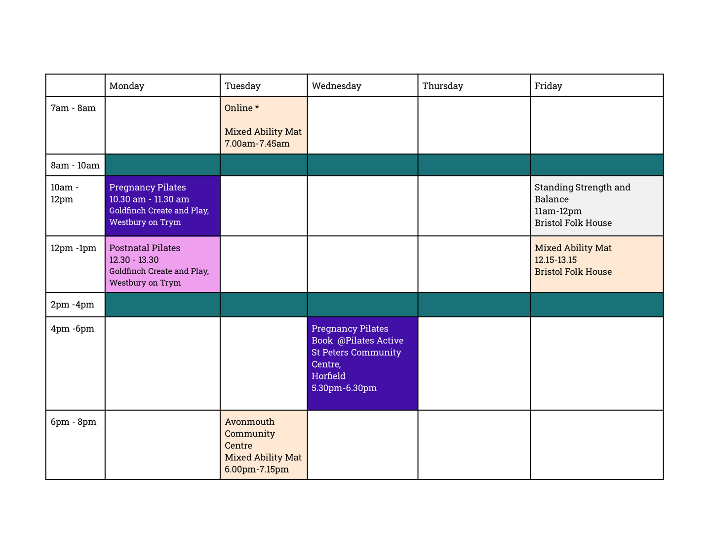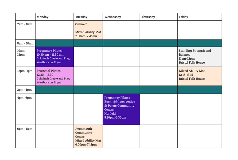 Weekly Timetable Pilates with Sylvia